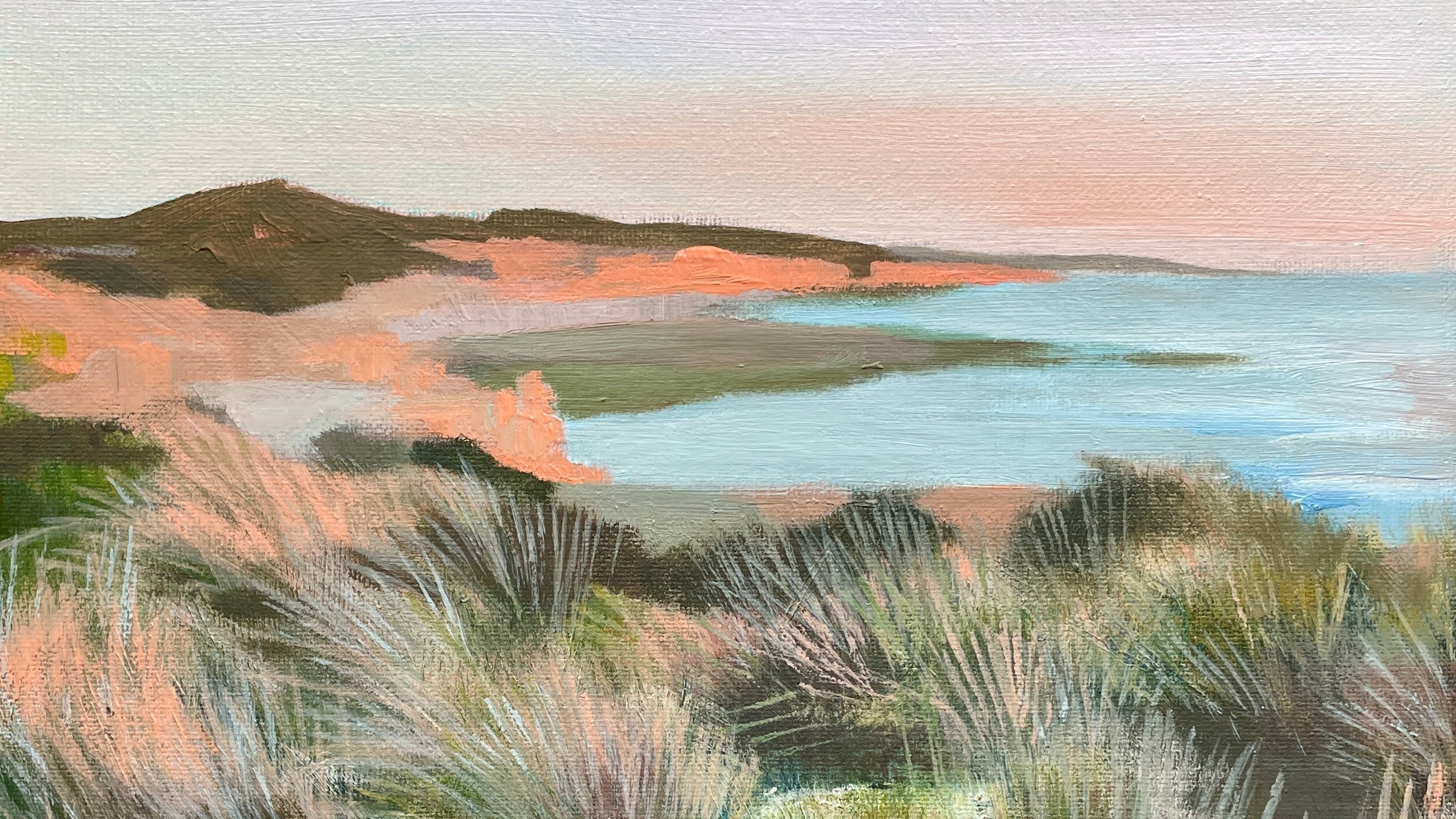 De Boise's landscapes are inspired by her daily walks with kelpie, Gary and often feature local flora set against an ever-changing backdrop of the coastline, throughout the seasons.